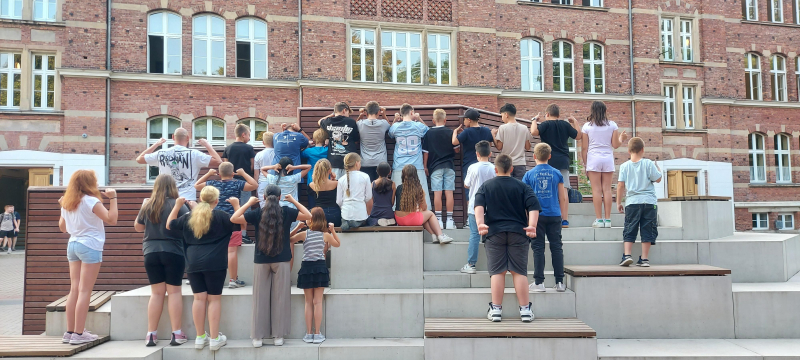 Gemeinsam mit dem Sozialpädagogen des heutigen Schlosses arbeiteten die Schülerinnen und Schüler an ihrer Teamfähigkeit, indem sie Probleme gemeinsam lösten, aneinandergebunden Strecken überwanden und einander blind vertrauen mussten.
